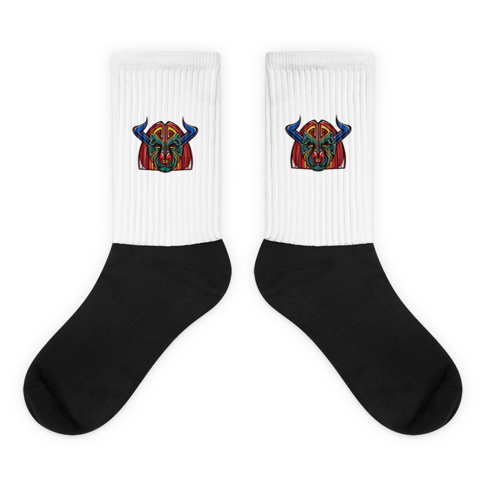 These socks are extra comfortable thanks to their cushioned bottom. The foot is black with artwork printed along the leg with crisp, bold colors that won’t fade.